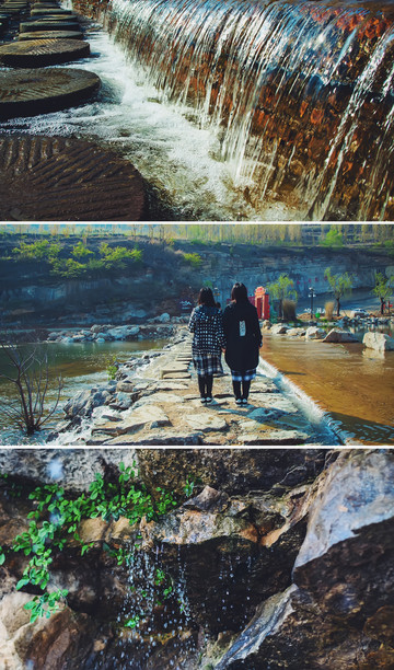景区用层级的拦水法造出了多层跌水的景观,铺在河道里的石墨盘便是小路,通向对岸,低下身子,接一捧河水,是清凉。对面的山石渗出山水,不断滴下,滋养着从缝隙中冒出的青草新芽,空气中满满的负氧离子,这是专属于清晨的气息。