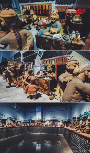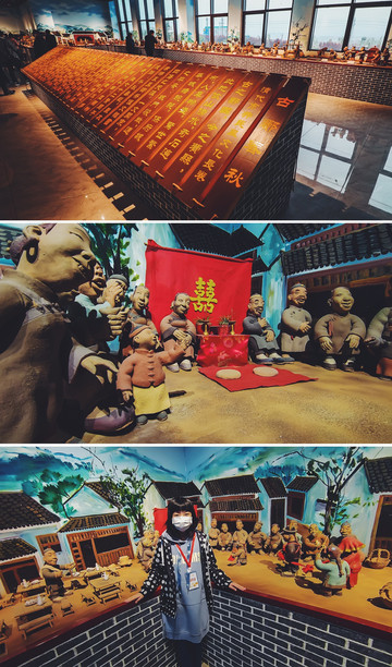 非常值得一提并推荐大家去看的是位于二楼的雕塑家黄永的个人作品展厅,黄永毕业于山东省特殊教育学校,是一位聋哑人艺术家,他利用自己对生活和艺术的理解,让陶艺作品在他无声的世界里替自己“说话”,在他的不断精益求精中,作品得到极大的认可,承担了很多沂蒙精神红色文创的创作,用作品展示沂蒙革命老区人民的生产生活场景及精神风貌,并多次获得国家、省、市奖项。也是“临沂市十大杰出青年”和“中共费县县委2015年度十大先模人物”。抛开荣誉不说,看黄永老师展厅的这组名为古鄪春秋·清代市井民风文化长卷的群雕作品,你真的会跟着每个小人的动作表情去笑,去体会它们的喜怒哀乐,非常有趣。