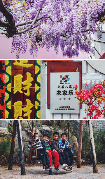 这里也是蒙山农家乐最集中的一块区域,整个村的人都多多少少从事跟农家乐和民宿相关的生意,各色推荐牌牌挂满了大门,所以每逢周末,远近的游客都会选择自驾来到这里,赏花,摘果,吃个农家饭儿,这不,四个小男孩就挤在一张摇椅上窃窃私语的瞧着我的镜头,冒着坏笑,果然是春天来了,疫情退了,所有人都开心了。