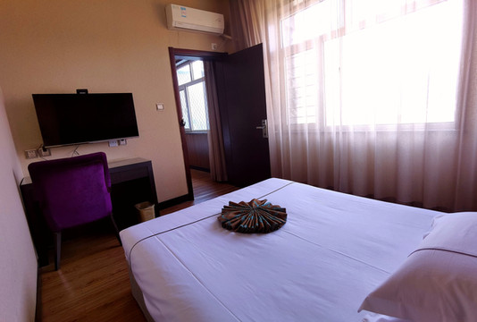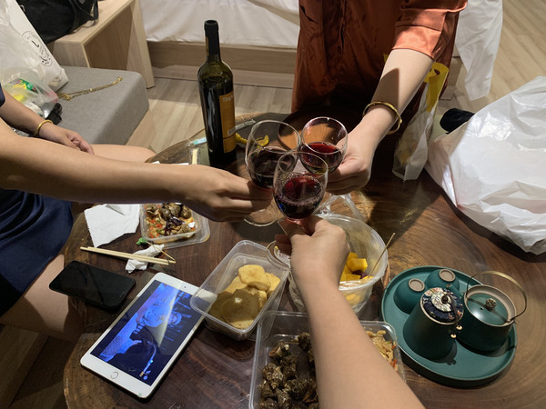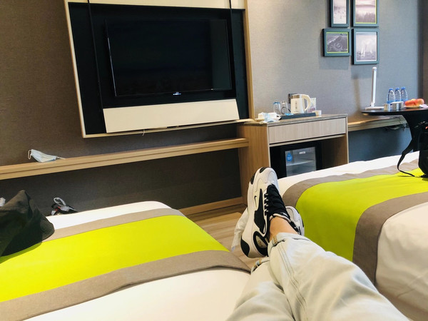 我们入住的是一间质选家庭房,一张1.2米的标准床和一张1.8米的大床,我们三个成年人住的非常的舒服,房间空间很大,房间内还有一个大大的木质茶几,沙发定制的非常合理,我们三人晚上畅饮非常的爽,房间居然还有小冰箱,冰箱里的酸奶,水,苹果,都是免费的,这300多块一个晚上的房间真是超值啊,我小伙伴带了红酒,酒店前台给我们送了红酒开瓶器和红酒杯,真的是超级完美!