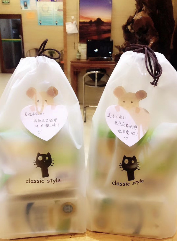 酒店早餐看网评很不错,遗憾这次时间不合适没有品尝到,退房时前台小姐姐看看我们出发这么早,特意给我们准备了路早,包装好有爱心啊,着实感动到我这颗?小红心啦?,好像是每天她们都会为来不及吃早餐的客人准备这样的一份爱心路早——有面包、鸡蛋、烤肠、牛奶,这一点真的是要给这个酒店一个大大的赞?