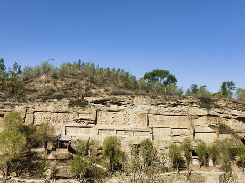 西岸壁上的书法石刻颇为著名,旧时边将、文人来榆林,多喜豪饮唱和,留下宝贵的书法艺术作品,字大者约6米,小者寸许,篆、隶、楷、行、草齐全,笔力雄健、挺劲,仰头观瞧很是壮观!