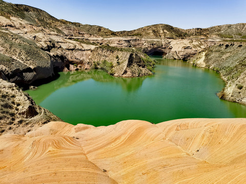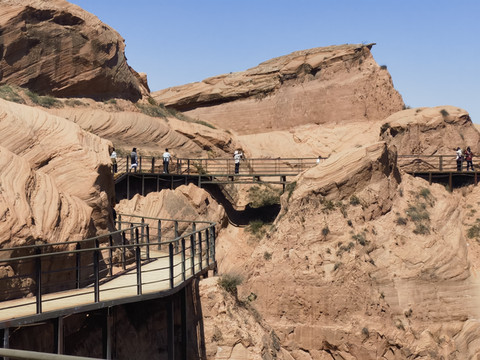 坊店水库仿佛是一块绿色的宝石镶嵌在红色山间,那种视觉冲击力非常震撼。在坊店水库那边下车后,下行到《鬼吹灯之龙岭迷窟》取景点喊船山。高处看山水相映,别有一番味道。之后回到主路上,沿途上行,可以在不同角度看山水,中途还可以看到窑洞等景观。值得一提的是,到逍遥谷景观,很多人都会错过,直接上车前行了。而在这里有条路是可以下到山谷中的,有一条小路蜿蜒通过谷底,这里从下往上看,才可领略红色山峡的壮丽。这里的路上来后可以到达一个站点。从这里上车可以途径老虎高原、博物馆等地后回到起点。