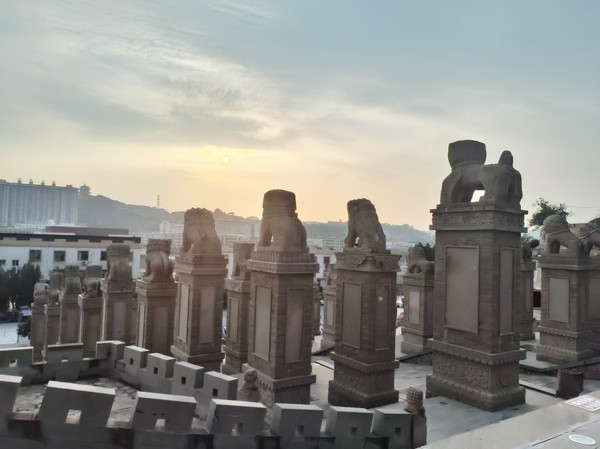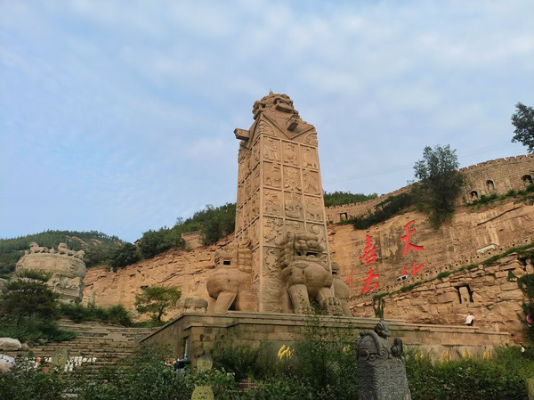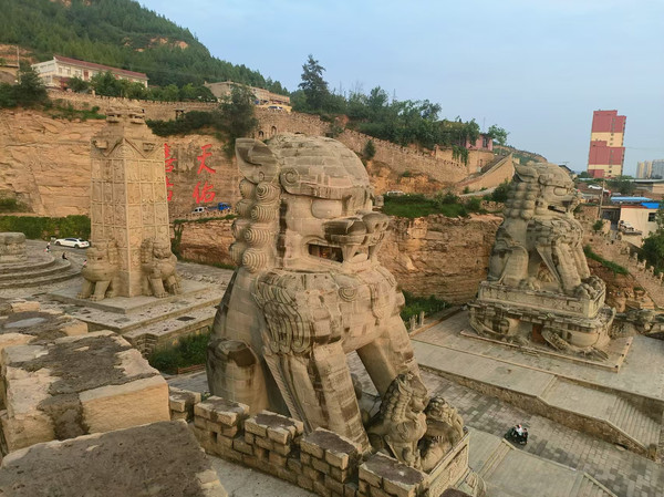 狮高19.5米,由1119块后头雕刻而成;是迄今中国最大的后狮。这尊雕像尽显绥德后雕的阳刚之美,也是我看到最大石狮子雕刻:再往前是石鼓;一大四小;右侧石碧上刻有四个大字:天佑善者。下面人们在排队接龙嘴流出山泉水;左侧是一些以往石刻;下面有一个醒狮特别不错。登高俯瞰县城;狮群面向西;镇守无定河和保佑全城人们。转了一天有些累了;溜达溜达回酒店休息了。全天27356步。