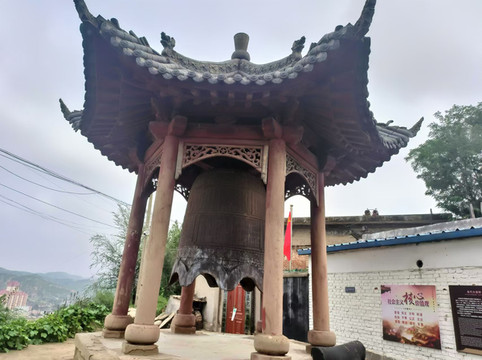 第九站:大定钟:大定钟位于绥德县名州镇东门墕钟楼山上,钟亭为木石结构六角亭建于二十世纪三十年代。内悬金大定二十年(1180)铁钟一口,钟身分上、中、下三层八区上层为铸钟铭文,中层和下层记载义合寨和李广寨等施款助援人等。下层饰莲花卷草纹,肩部有四个散音孔,口沿波峰以上饰有八卦,钟基本完好。此钟原为城西天宁寺寺院之钟,有“西寺晚钟”之称,为绥州八景之一。二十世纪三十年代搬迁于现址,用于防空警报,由于体积大,音响纯厚宏亮,击之方圆三十里亦可闻声。按指引;前往;坡度特别大;估计有45度;看到了自然生长的枸杞子;上到坡顶;有一个挂大钟亭子。铁钟上的刻字;不太好读。从此处可以看到绥德全景;拍拍照和视频位置不错。