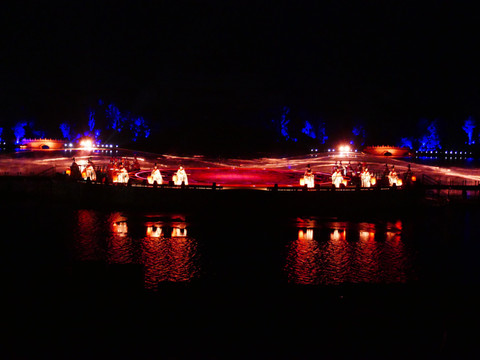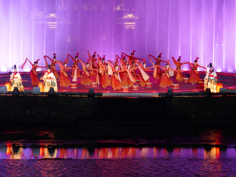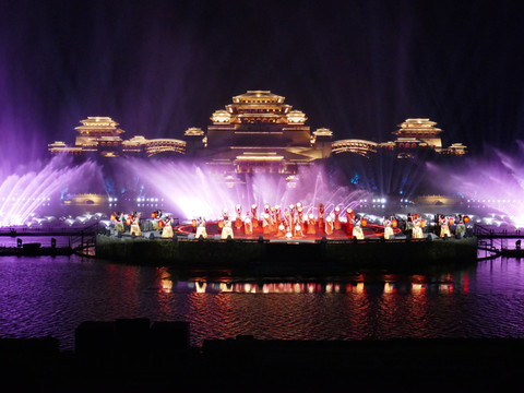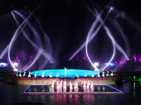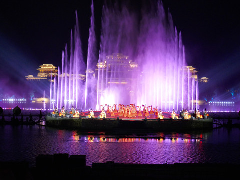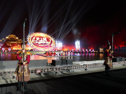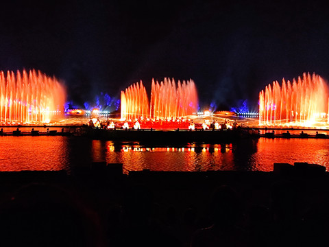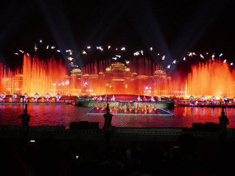 大部分人来兴汉胜境景区,除了看一看汉式园林建筑及内部陈列,最感兴趣的是《汉颂》和《天汉传奇》两场演出。白天的室内演出《汉颂》前面已介绍,晚上的露天演出《天汉传奇》在汉源湖边,也是声光电歌舞表演,通过水上投影、水中造型以及水幕、喷泉等创意与特效,展示汉魂、汉音、汉风、汉艺等汉文化。演出时长45分钟。