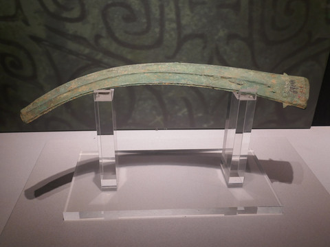 镰形器(商代)。城固独有的一种青铜器,迄今全国其它地区尚未发现。这是一种祭祀活动中使用的礼器,祭祀者手持器具,随乐曲舞动,作收割之姿,以祈五谷丰登。