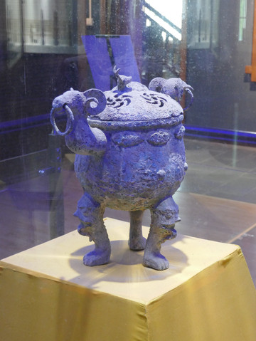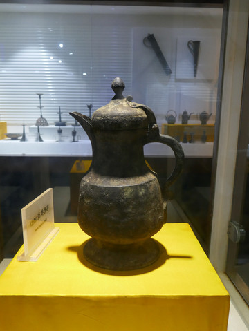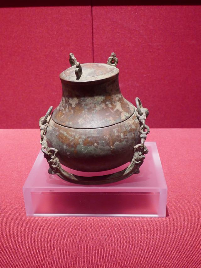 提梁三足铜卣(汉代)。卣(yǒu),古代盛酒的器具,口小腹大。