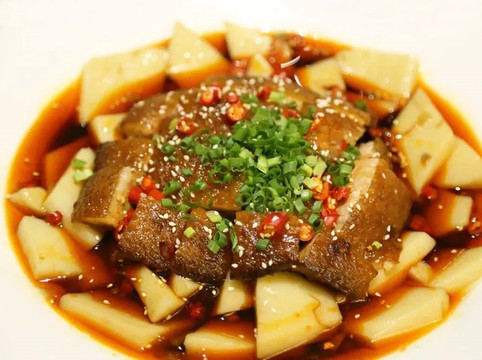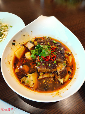 凉粉酿肘子:带皮五花肉与大米凉粉,搭配小米椒、冰糖、高汤等调味品酿制而成,肉厚汁浓,肥而不腻。