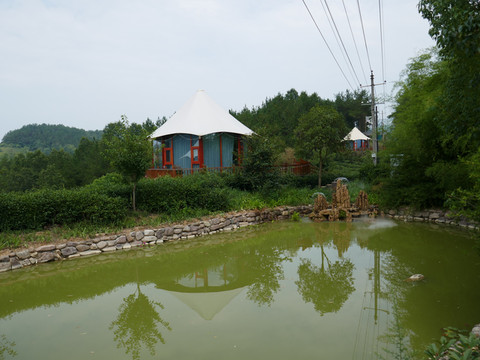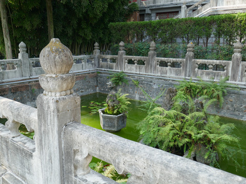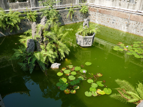 镜吾池,长13米,宽6米,中为石拱桥,分别刻有龙、虎。池边石头上的诗句为:池塘如镜水平芜,照得今吾即故吾。莫笑萍踪飘不定,春风一约自同趋。