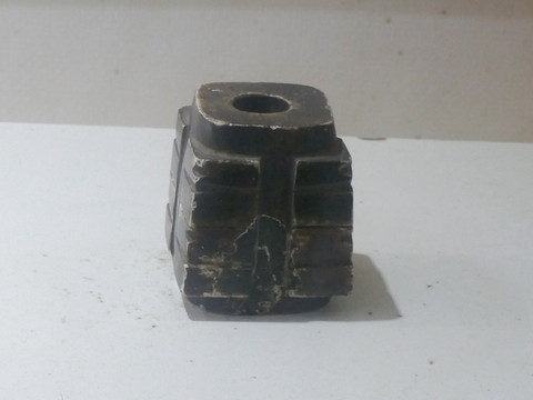 罍分为方罍、圆罍,圆形的比较常见,方形的较少。该罍纹饰十分精美,肩两侧施牛形首一对,背面腹下部有一羊首盖、颈四面各施一道扉棱,盖和握手皆饰倒置卷角饕餮纹,握手纹饰以细阴线纹表现,颈部以扉棱为界,饰一对相对的夔纹,组成饕餮面,肩部两面各饰一高浮雕,卷角为两部分,上部为涡纹间饰夔纹,两面各有五个涡纹。整体来看,形制与殷墟妇好墓出土的方罍几乎一样,是典型的中原之器。目前国内出土的同等级别的方罍,不超过10件。