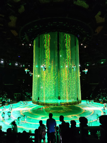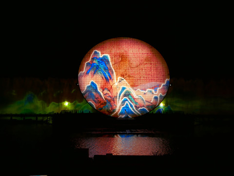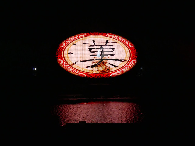 第三章:春生夏长,天地和安。春生夏长,万物繁盛。刹那,傩面人偶祭天狂舞,述说生机勃发的熊熊气势、天地同欢之乐。一座博山香炉缓缓从水中升起,腾腾水雾四起。湖水色彩随之冷绝,带来一丝神秘气息。刹那,电光忽闪,两艘傩面大船鬼魅驶来,众傩面人偶簇拥大祭司喷火戏水,祭天狂舞,呈现天地同欢的大汉盛世。当湖水渐静,一抹新绿蔓延水面,如生机盎然的繁茂大树,万物繁盛,是那盛景后的安泰和乐。