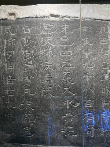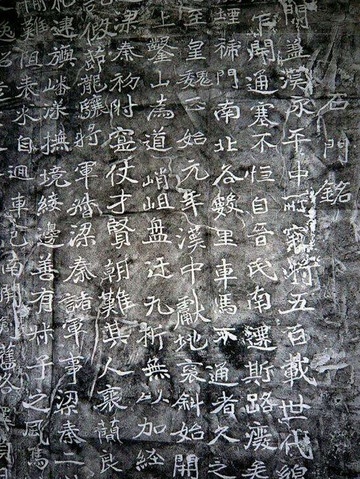 ▲鄐郡开通褒斜道摩崖石刻,简称大开通。刻于东汉永平六年(公元63年),曾被认为是我国早期的摩崖石刻(后发现的何君阁道碑年代更早),其书体为篆书向隶书过渡的典型代表。主要记载了东汉永平年间开通褒斜道的历史。全文原有159个字,由于石刻属于云母片岩,经过一千多年的风雨侵蚀、剥落损毁,现仅剩下97个字。