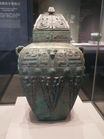 兽面纹铜方罍(商代),一级文物,镇馆之宝。高51.2厘米,面宽15.3厘米,底面宽12.8厘米,侧宽11.8厘米,重21.25千克。罍(léi)是古代一种盛酒的容器,小口,广肩,深腹,圈足,有盖。