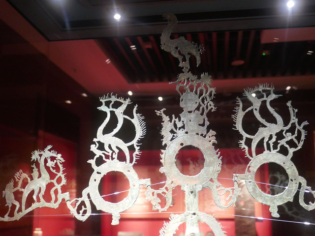 铜摇钱树(东汉)。“摇钱树”是一种特殊的陪葬用品,主要分布在四川、重庆、云南、贵州、陕西、甘肃、青海、宁夏、湖北等地,目前已发现的摇钱树近200例。最早的摇钱树在东汉早期,数量稀少,集中在成都平原地区;东汉中期和晚期该器物迅速流行,覆盖四川、重庆及周边地区;东汉末到三国时期,数量锐减;西晋时彻底消失。