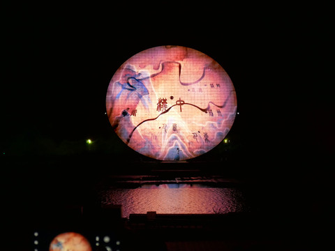 第二章:弦歌不辍,乐舞蹁跹。香烟袅袅,朦胧水雾,映照仙子乐舞画影,以大汉乐舞展现新生活力。夜空透映着汉文化博物馆的点点光亮,旱莲仙子乘船而来,用湖中对影展现乐舞弦歌的绵延,用柔美的斑斓色彩凸显出歌舞翩翩的欢畅淋漓。以弦歌乐舞之景,承接地启双源,展示大汉文化歌舞和乐、大地滋润的新生活力。