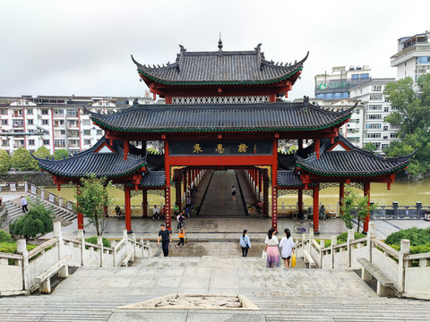 我国古代建筑的屋顶有很多组合形式,从其规格可以估量一座建筑的地位。望江楼最上面的屋顶为四角攒尖顶,两侧稍稍插入庑殿顶,其下又插入歇山顶,集屋顶造型之大成,是一座具有地方特点的大型古建筑。