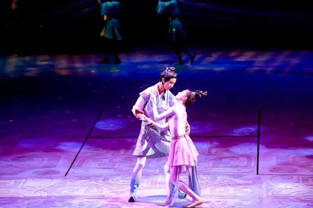 第一幕:牛郎织女 鹊桥相会。迢迢牵牛星,皎皎河汉女。纤纤擢素手,札札弄机杼。在婉转悠扬的歌声中,七仙女从空中飘下,翩然起舞,与闪烁的光影交相辉映。牛郎织女在鹊桥相会,执手相望,沉浸在重逢的欣喜中。愿时光流转,唯爱永恒;愿心之所向,方得始终。