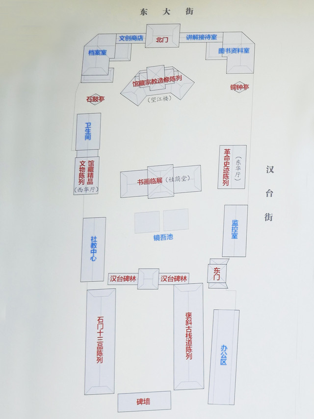 古汉台馆区依托刘邦受封汉王时的行宫原有建筑风貌和园林布局,自南而北分为三个院落:北院的望江楼、石鼓亭、铜钟亭;中院的东华厅、西华厅、桂荫堂、镜吾池;南院的褒斜道陈列室、石门十三品陈列室、汉台碑林、碑墙。馆藏文物4800多件,其中一级文物45件,尤以“石门十三品”驰名中外。