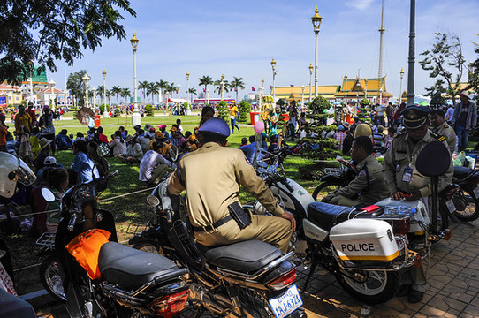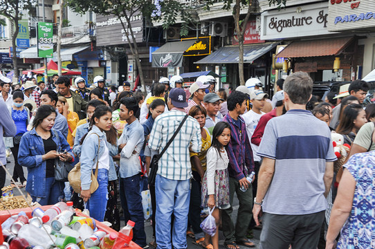 王宫附近的河边已经有很多人了。金边的飞车党很厉害,经常可以听闻有中国人被抢的消息。所以在这里背包要双肩背,前面最好要扣好。我看到就连白人也很注意。