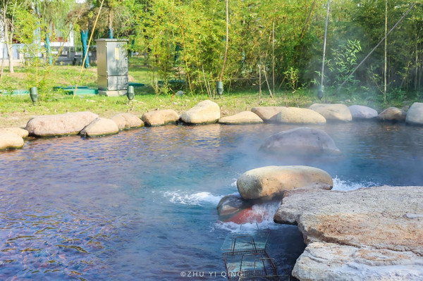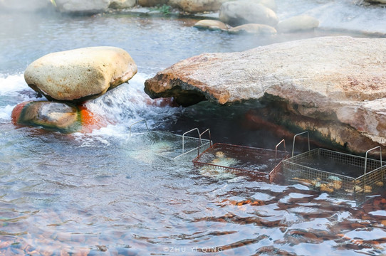 没想到大洋湾中还有一片温泉,大洋湾景区其实有着丰富的温泉资源,有两口温泉井,一号温泉眼,这是从地下1500米处挖出来,出水温度50℃,试了试水温,还挺烫的。在温泉水里,挂着几个铁框子,原来是在煮温泉蛋。