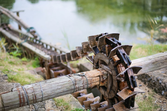 各种各样的水车道具让人玩心大发,这里是大纵湖一个特别之处,这些木头做的水车,看起来好老,是老一辈用过的水车,高处的农作物要灌溉,用这个就能把水从低处引到高处去。虽然现在看起来很不起眼,但是在那个年代,它的价值和作用是不容小觑的,它体现了人类的聪明智慧,也是文明进步的见证。
