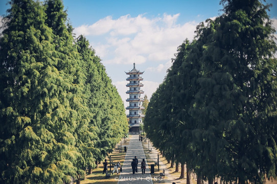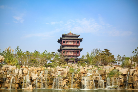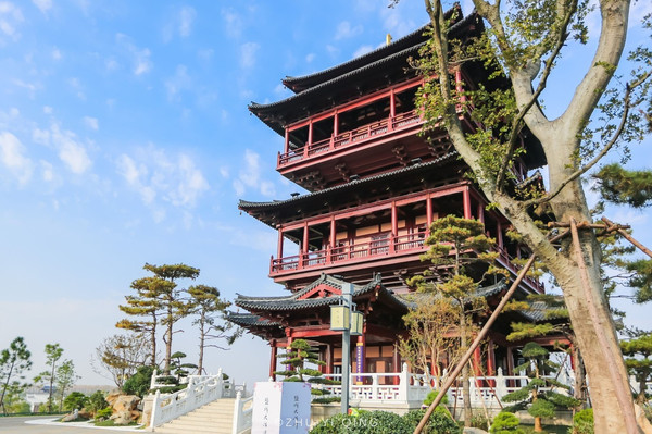 要想看清大洋湾的全貌,那一定不要错过园区制高点登瀛阁,它是大洋湾地标性建筑,在山水瀑布的衬托下,这座5层高的登瀛阁尤为壮观。建筑采用唐宋风格仿古结构,出檐深远、体量高大,设置平坐,四面出抱厦。登瀛阁位置的巧妙之处是在于,它正好处在正子午线上,四个屋脚分别指向东南西北四个方向。