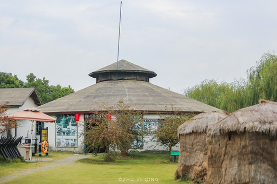 观赏芦荡迷宫上岸后继续沿路前行,不远处就可看见柳堡村的门头。这是一处根据电影《柳堡的故事》部分经典场景改造的景点,据说那电影就是在这一带拍摄的。这里有爱国主义教育基地,如新四军大礼堂,也有酿酒、制豆腐等作坊工艺展示,而最吸引人的是风车与水车抽水活动的参与,池塘边的一架架水车上时不时涌上一群参与的游人。