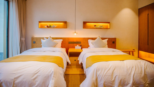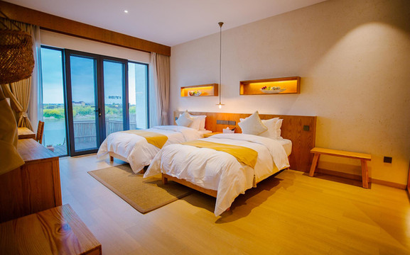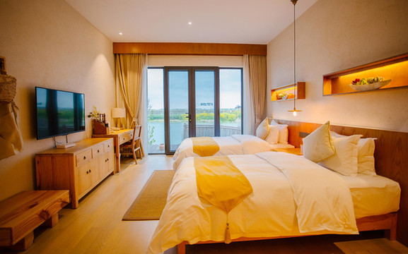 推门而进,宽敞而明亮的客房,配搭别致的家居设计,让人更加住的舒心,原木色的室内家居,自然古朴,超大落地窗的视野通透,清新又温暖;就地取材的整体配饰,融合了兴化的水乡特质,更是让室内更多了一份野奢的味道。