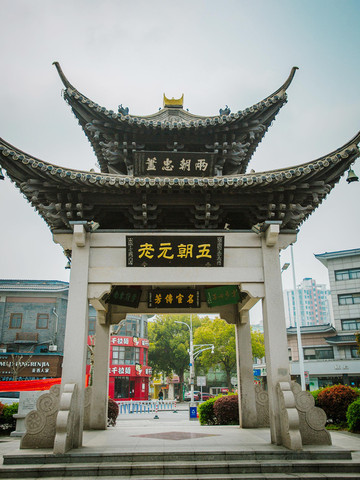 出来走上两步就是兴化的四牌楼,四牌楼为四门四柱的亭阁式,两层重檐,八角飞檐,顶上“五岳朝天”,周挂铜铃,显得庄重典雅而又奇特。走到“四牌楼”的楼阁里,你才知道“玄机”暗藏其中,抬头仰望,就会情不自禁的惊呼,牌楼顶部层层叠叠的悬挂了47块牌匾,据说这些牌匾都是为了表彰兴化历史上的杰出人物而设立,极为壮观。