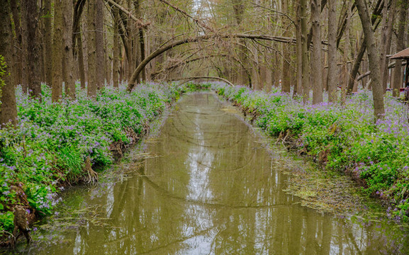 不巧来的时候水杉还未变绿,青黄不接的样子看起来略有萧瑟,但你可能不知道的是,现在正是二月兰盛开的好时节,往里走进入林海迷阵,水道两岸,一排排的杉木,正在抽出绿油油的新芽,林间间杂着紫色的小花,看起来格外清新雅致。