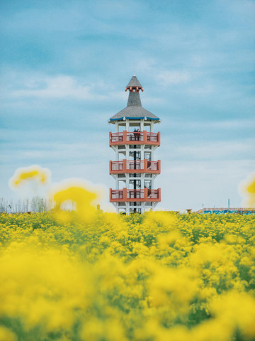 从南入口进入景区不远处有一座瞭望塔,三层,直径十来米,是景区的制高点,也是观景拍照的好去处。