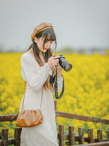 借助道具:如果有条件的话,可以带上帽子、气球、相机、伞等作为道具配合拍摄,也可以低头看油菜花,闻花香或者抬头仰望天空等等。