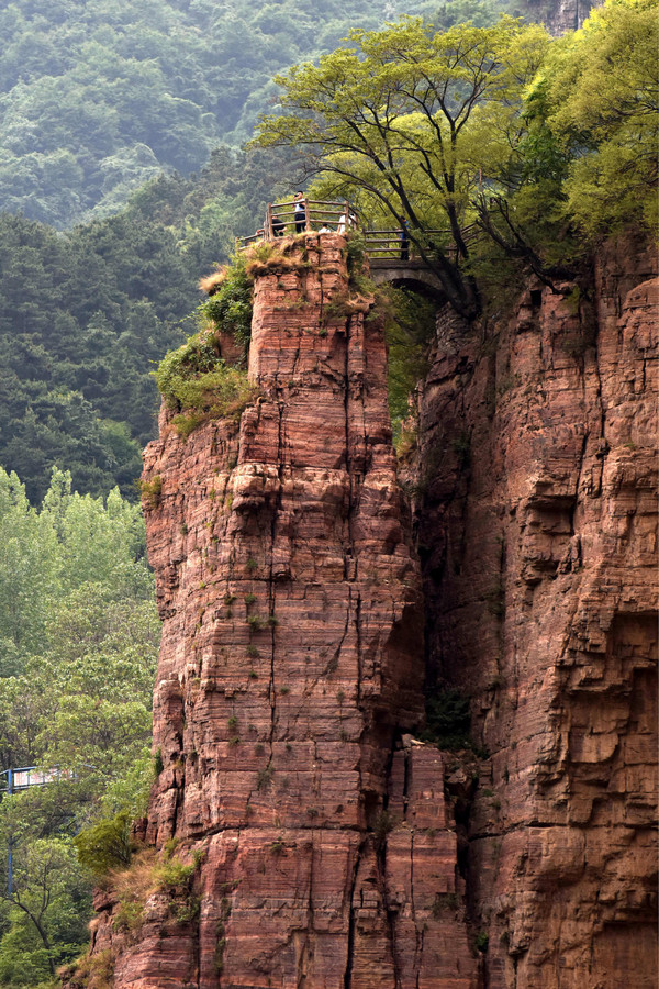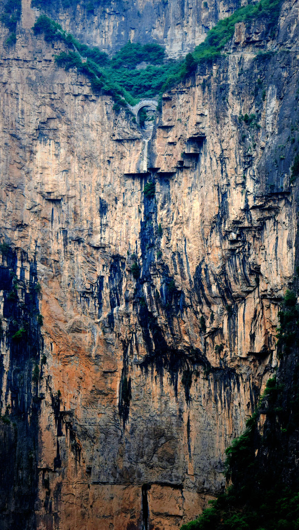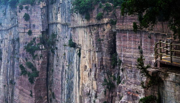 挂壁栈道,百丈悬崖上的木制护栏,歪歪扭扭地贴壁而设,给人一种简陋、极度不安全的感觉。
