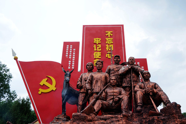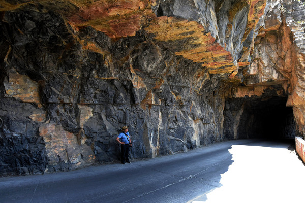 回龙挂壁已不仅是前往老爷顶的通道,还成了一道振奋人心的红色景观。隧道出口的两端,立着英雄们的雕塑,洞内挂着他们开山劈岭的巨幅照片,一支支队伍举着旗帜前来接受教育。