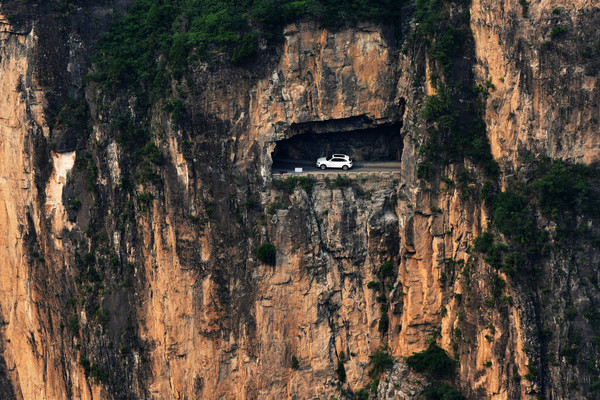 从高处远眺悬崖上的挂壁公路显得更为震撼,石玉线上的这个观景台就是欣赏穽底挂壁公路外观的极佳位置。200多米高的悬崖中间,穽底挂壁的39个洞路侧窗,有的就如一个个的句号,有的就像一段段的破折号,它们连在一起清晰地勾勒出了穽底隧道在绝壁上的走向。