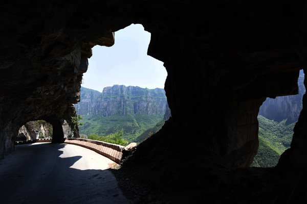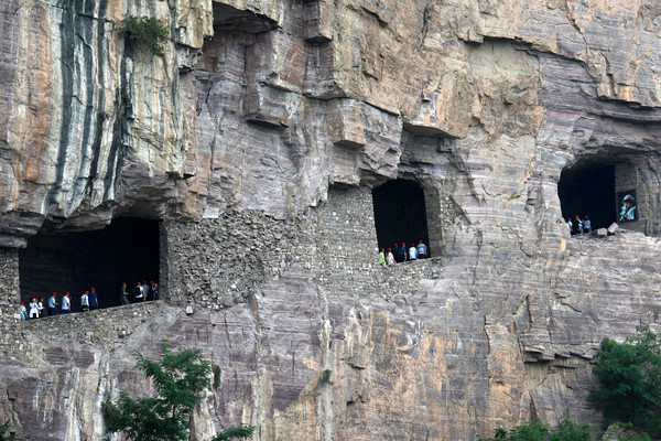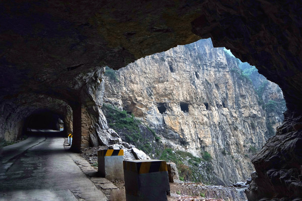 锡崖沟挂壁最大的特点就是洞内盘山、螺旋上升,从隧洞的侧窗就可看出,它在一面绝壁上共有三层,呈“之”形一直盘到王莽岭山顶。