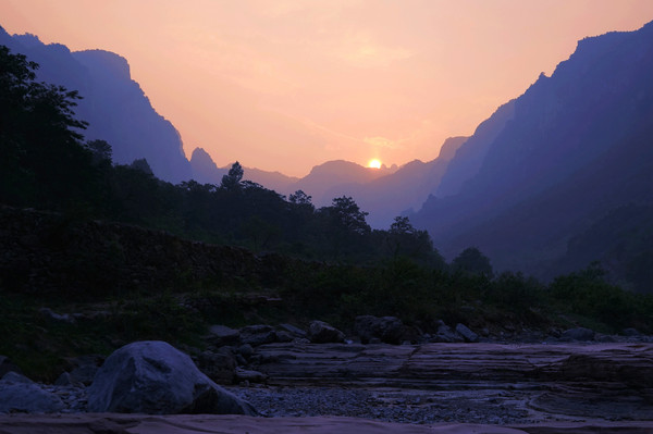 经过艰苦跋涉,终于在日落西山之际到达村边。加上在老爷顶的行走,我们今天徒步了近20公里,体力达到极限,落日的余晖让我们当做了胜利的曙光。
