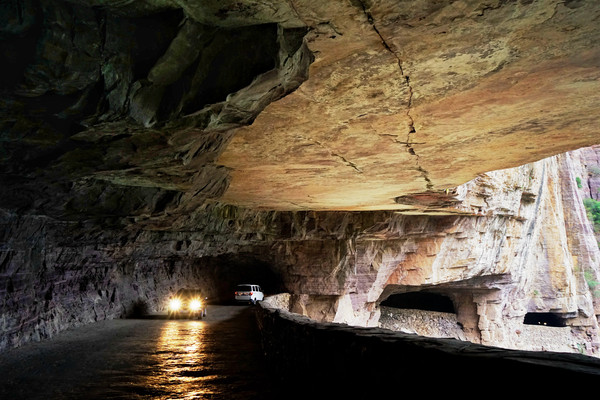 这是一条野性十足的挂壁,头上峭壁凌霄,脚下峡谷幽渊,洞内昏暗,洞壁狰狞,路面坑洼起伏,砂石泥土混杂,车轮碾过,尽是嗞嗞作响、一片尘土飞扬。初驶挂壁公路,我们于颠簸中体验了挂壁公路的神奇和沧桑。