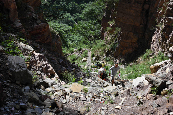 由于上山坐了电梯,使我们感到攀而不武,因此果断跟在一支3861部队的身后,在峡谷乱石中择路而下。
