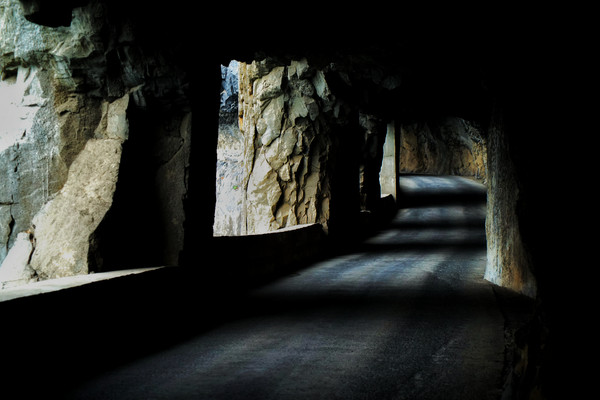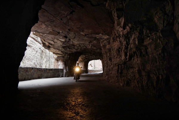 这是一条野性十足的挂壁,跟郭亮洞的红岩晴日、人潮欢声截然相反,是我们心目中挂壁公路所应有的味道。寂静的大山,粗犷的隧洞,36个狰狞的侧窗透着昏暗的光线,嶙峋的岩石留着开山时的钎痕,仰望是千尺高崖,俯瞰是百丈深渊,令人感到既刺激又震撼。