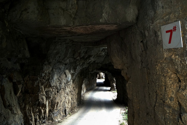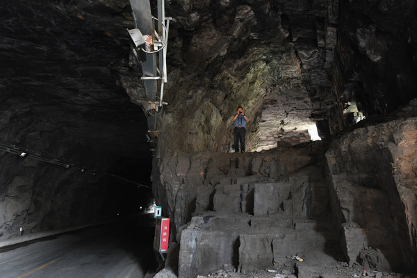 回龙挂壁不足千米隧道,水泥铺地、条石固窗,极为“奢华”,它的特点是洞内S形迂回盘旋,洞外连接的是8公里长油黑发亮的下山公路。