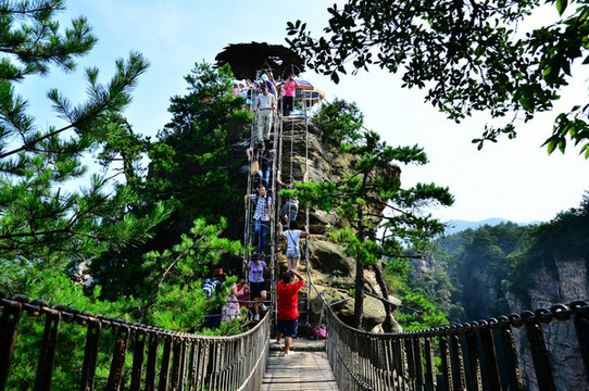 8. 天下第一桥、迷魂台、后花园:在张家界景区的袁家界,这几个景点是张家界地质地貌的代表,这里五步称奇,七步叫绝,十步之外,目瞪口呆!相对来说,前面几个景点是张家界较原始、粗犷大气的一面,而这几个则比较温柔细腻。是张家界四大奇观(日出,峰林,冬雪,雾海)之一----雾海的观赏点,此处雾若有若无,时隐时现,不知何时出现,也不知何时消失;云雾翻滚,群山时隐时现,变幻莫测,使人难辨天上人间。这是旅行团队的必经之地,游人较多,可以要求导游安排在大部队不集中的时间游览。对于休闲游的游客来说还有一个好处:就是景点相对集中,体力消耗不大,很轻松的游玩。(超多的人,都是直接从百龙天梯上来的旅行团。但是这段以平地居多,走路不累)