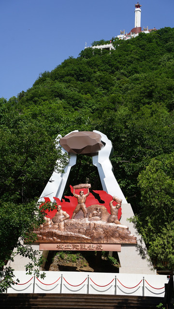 (5月25日)今天沿涞涞高速到位于易县的《狼牙山景区》。在路上就可见一山如锯齿横卧于华北平原。狼牙山又称郎山,主峰海拨1105米,属太行山脉,抗日战争时期,狼牙山根据地是晋察冀边区北大门,1941年9月5日,狼牙山五勇士抗击日寇,英勇跳崖的英雄事迹就发生在这里。