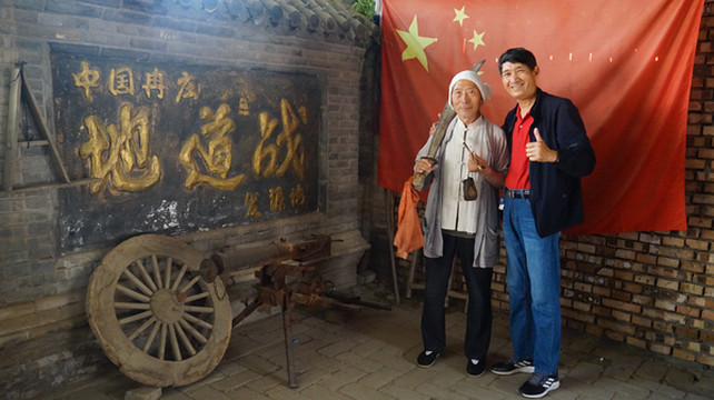 和当年抗日老村长儿子合影。冉庄也是多部影视作品拍摄地,《地道战》、《平原游击队》、《烈火金刚》等。