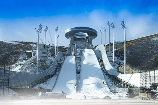 我们进入崇礼地界后,直奔国家跳台滑雪中心。主体建筑设计灵感来自中国传统饰物“如意”,从跳台环形顶端,再到剖面线形和底部看台,与“如意”的S形曲线完美契合,因此被称为“雪如意”。既体现了体育建筑的动感,又凸显了中国文化元素。