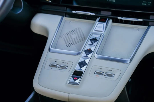 在这个左右两侧,还有专为驾驶者和前排乘客设置了放手机的凹槽。不仅如此,驾驶者侧的凹槽还有50W的感应式无线快充,免去了插拔充电线的麻烦,而且无线快充下还有内置小风扇,充电既快而且还不发烫。