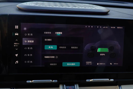 一路高速路况,为了感受纯电行驶的最大能力,我们出发后一直选择这一模式,行驶80多公里后,剩余电量为15%,此时发动机开始不知不觉地自主介入了。不仅如此,系统还能进行动能回收,为电池充电。这样油和电相互配合,续航里程能超过1200公里。