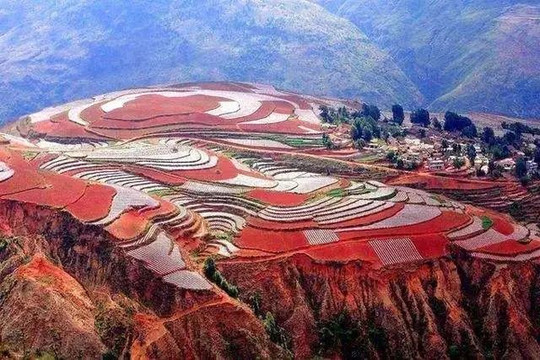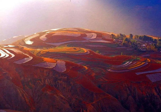 东川红土地位于云南省昆明市,因土壤里含铁、铝成分比较多,就形成了炫目的赤红色彩。