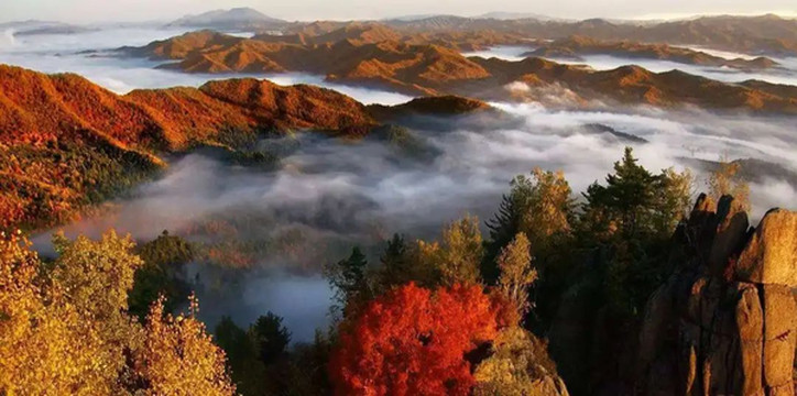 金秋十月,树叶渐次褪绿,渐染红色,与充满灵气的山谷、清澈的溪流,演绎着绚烂秋色。